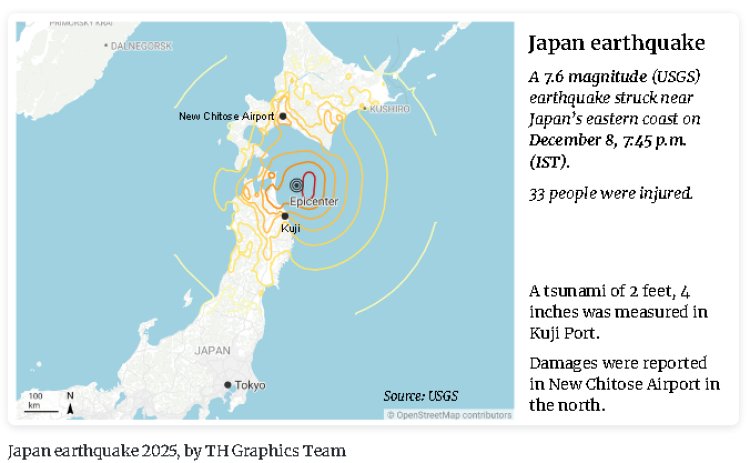 About 80 kilometres off the coast of Aomori, the northernmost prefecture of Japan's main island of Honshu, the 7.5-magnitude earthquake occurred in the Pacific Ocean at 11:15 p.m. The earthquake had a magnitude of 7.6, according to the U.S. Geological Survey, and it happened 44 kilometres below the surface.