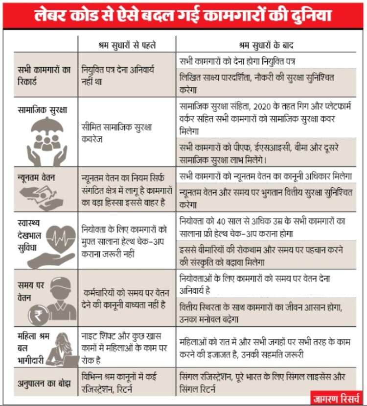 The central government has taken a major step toward labor reforms by implementing four labor codes. These reforms include social security for gig workers, appointment letters for all employees, and permanent employment for contract workers. The five-year requirement for gratuity is no longer in place, and rules for overtime payment have also been changed. Women's safety and minimum wages have also been guaranteed.